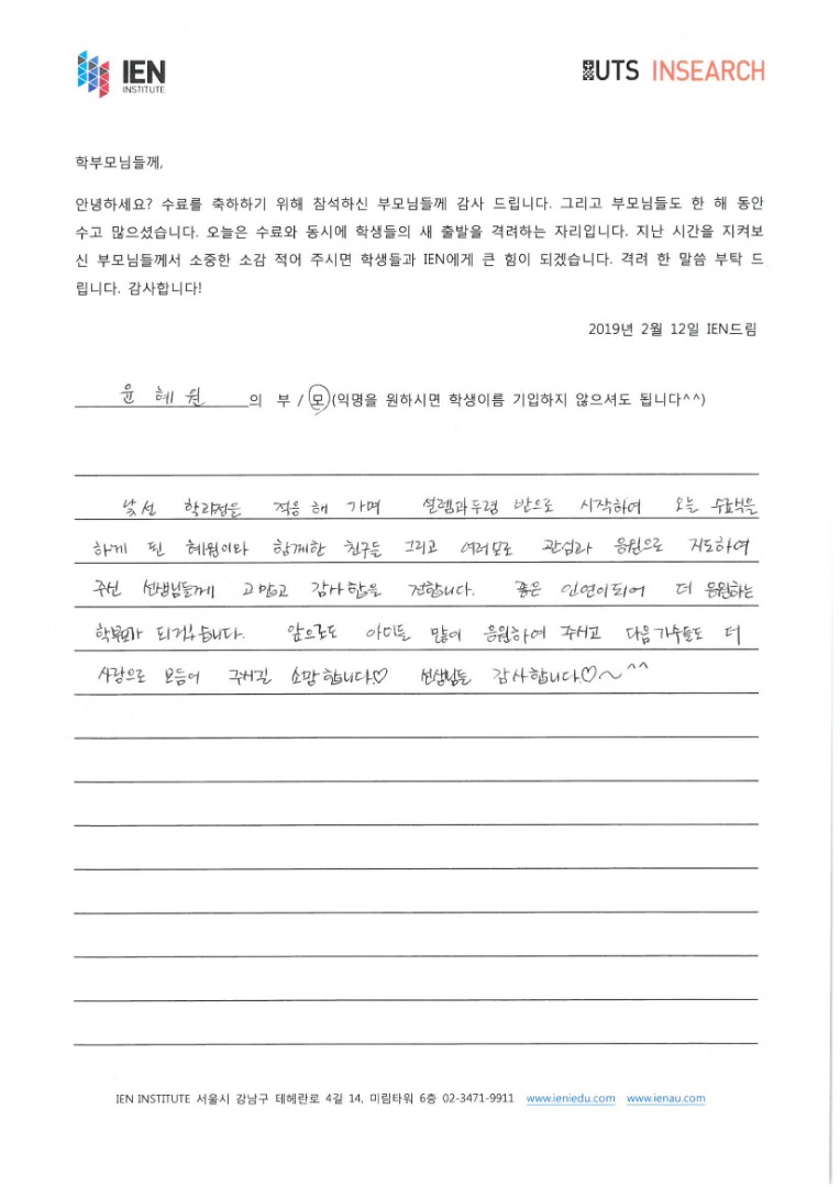 오늘 수료식에 참석하게 된 혜원이와 함께한 친구들, 그리고 관심과 응원으로 지도해 주신 선생님들께 고맙고 감사함을 전합니다.